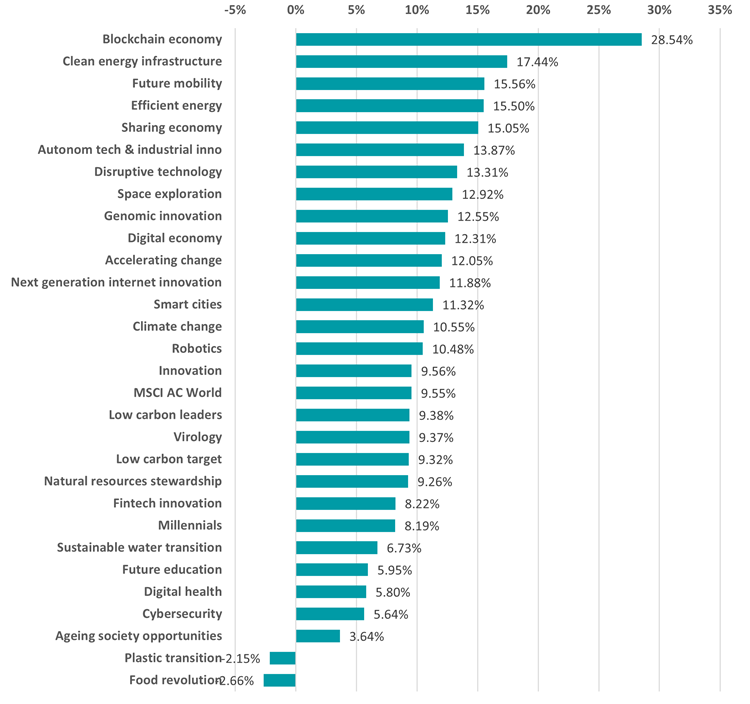 Blockchain economy stocks delivered the standout thematic performance with a 28.5% return during the third quarter of 2025, significantly outpacing the broader market and other technology themes. This reflects renewed investor enthusiasm for cryptocurrency and distributed ledger technologies, driven by regulatory easing and institutional adoption.