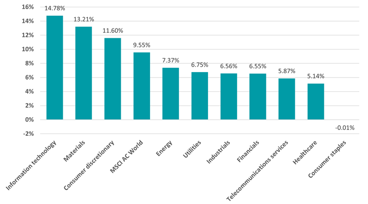 Information technology dominated the quarter with a 14.8% return, followed closely by materials at 13.2%, highlighting how the AI-driven rally powered tech stocks while commodity-related sectors benefited from supply concerns. Consumer discretionary also performed strongly with 11.6% gains, reflecting robust consumer spending and confidence in economic recovery prospects.