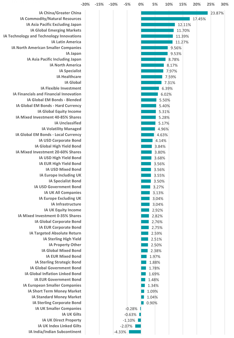Similar trends were seen in the Association of Investment Companies universe, which was led by the IT China/Greater China (up 31.5%), IT Commodities & Natural Resources (29.7%) and IT Technology & Media (18.9%) sectors.