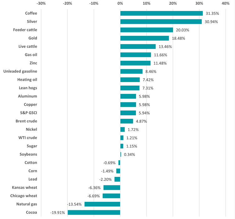 Coffee, silver and feeder cattle were the top-performing commodities of the past quarter, but investors focused on the rise of safe-haven metal gold.