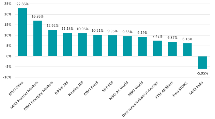 As the chart above shows, emerging market equities made the strongest gains over the past three months, led by a significant rally in Chinese stocks. India, however, was down during the period on the back of a pullback from foreign investors and tariffs from the US.