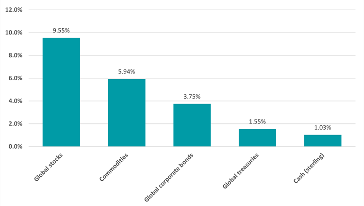 Corporate bonds posted a 3.8% gain while government bonds returned just 1.6%, as credit outperformed sovereign debt while risk appetite remained strong. Commodities delivered a 6% return.