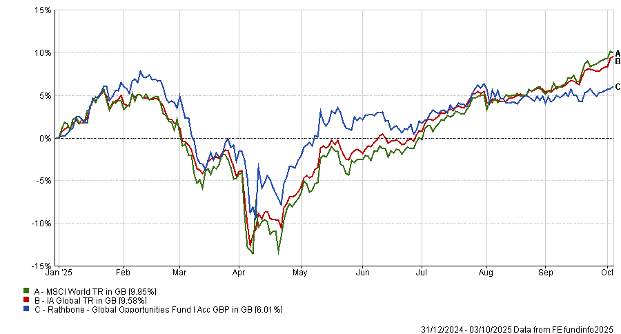 Indeed, while Thomson’s Rathbone Global Opportunities fund has fallen behind the average IA Global sector peer during the recent rally, it also slid less than the average competitor during the downturn this year.