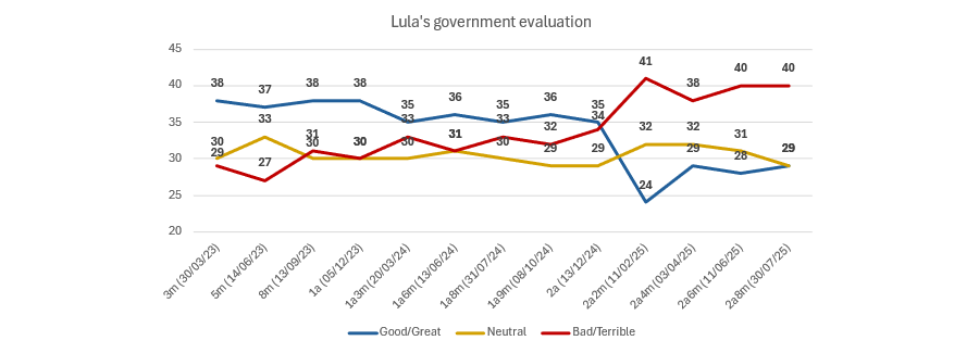 Since then, economic headwinds have eroded support further. Approval fell to an historic low of 24% in February 2025, before a brief rebound to 29% during US tariff tensions as Lula positioned himself as defending national sovereignty. This uptick appears temporary rather than evidence of sustained satisfaction with governance.