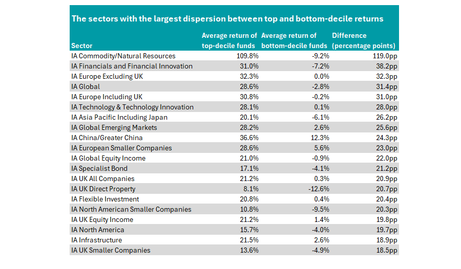Trustnet looks at the dispersion of returns between the top- and bottom-decile performers in each sector so far in 2025.