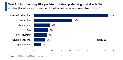 Turning to 2026, 42% of respondents said they expected international equities to outperform next year, with the US in second at 22%. Commodities, gold, crypto, government bonds and corporate bonds also made the list.