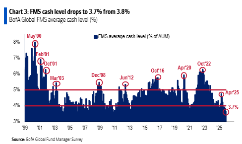 It is worth noting, however, that in the 20 times that cash levels have stood at 3.7% or below, stocks fell and Treasuries outperformed in the following one to three months.