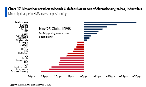 Survey respondents shifted their allocations last month into healthcare, bonds, staples and banks, while shifting away from consumer discretionary, telecoms, industrials and UK stocks.