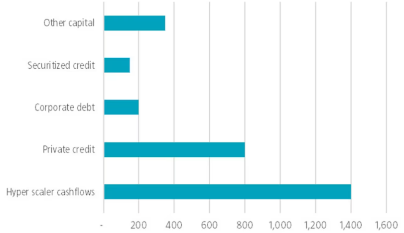 As shown in the graph below, it has nonetheless been estimated that the vast majority of global infrastructure capital investment over the next few years will be funded by hyper-scaler cashflows.