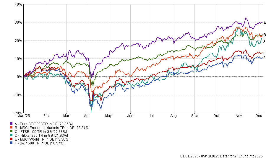 “Despite this, a sterling-based investor would still have been much better off investing in the UK, Europe or even Japan for 2025. This is because a weaker US dollar (or stronger British pound) has been a headwind to US equity returns for UK-based investors.”