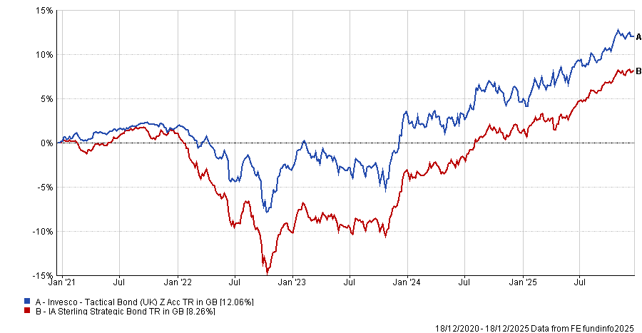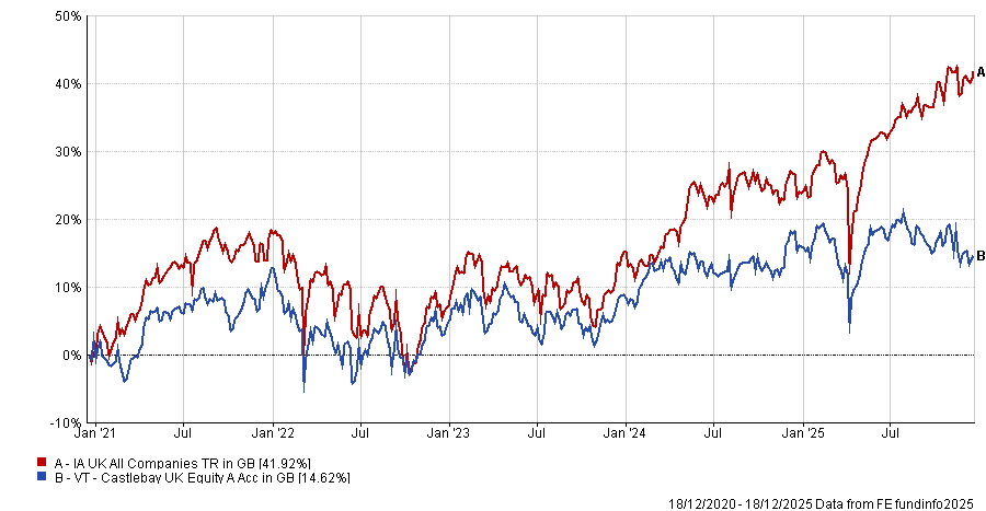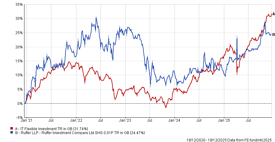 Source: FE Analytics. Total return in sterling over 5 years to 18 Dec 2025