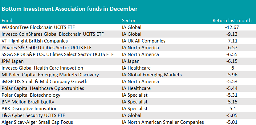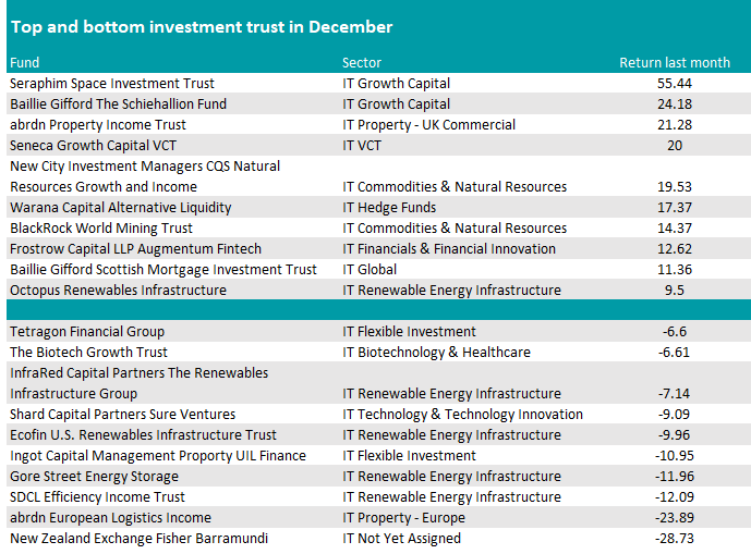 Technology, biotech and healthcare-based trusts slumped, similarly to their OEICS counterparts – for example, the Biotech Growth Trust lost 6.6% in December.