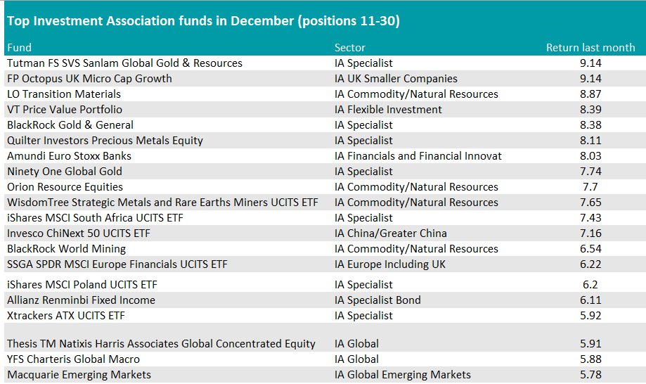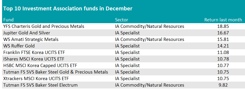 Gold and Korea were the most successful investment themes in December, dominating the list of the top 10 funds of the month, data from FE Analytics has shown.