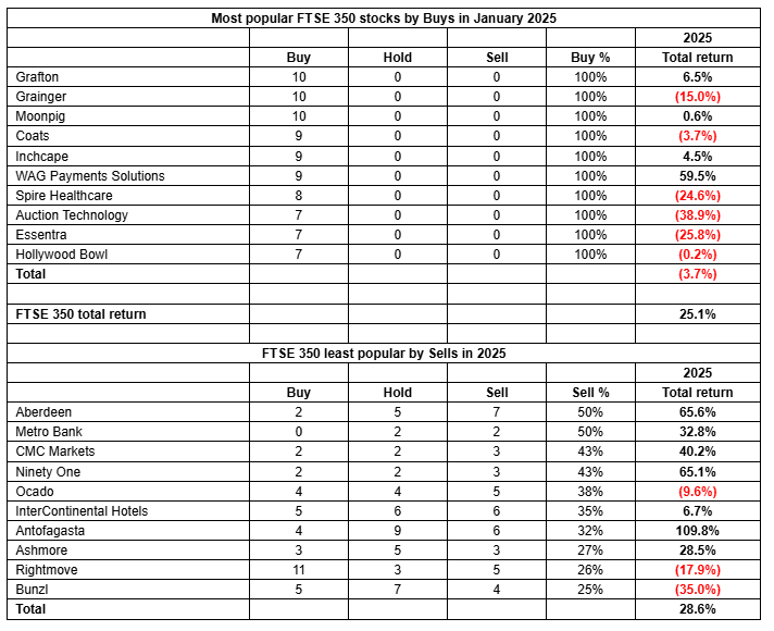 “Analysts covered themselves in glory in 2025, as their top picks outperformed and their least preferred names did less well than the FTSE 100,” Mould said.