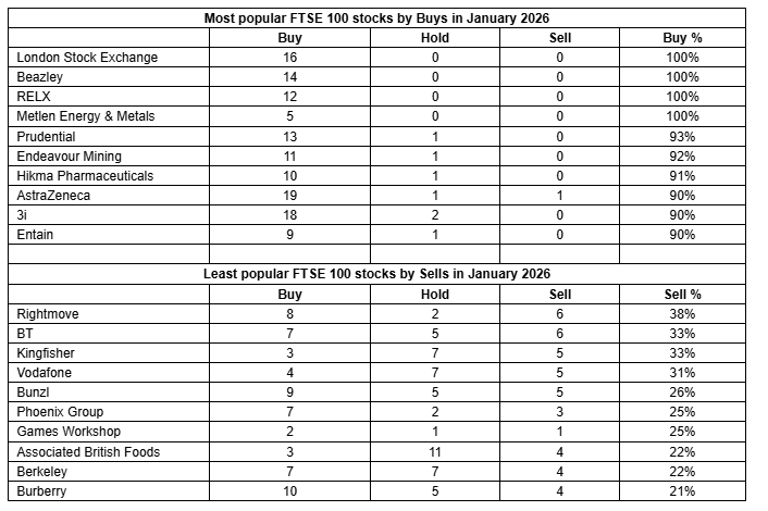 Other heavily favoured names include Prudential with 93% buy ratings and both AstraZeneca and 3i at 90%. Endeavour Mining, Hikma Pharmaceuticals and Entain also feature amongst the top 10 most popular stocks.