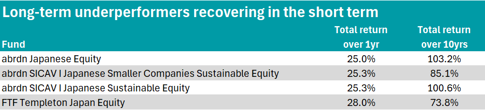 Its small-cap sister strategy, Abrdn SICAV I Japanese Smaller Companies Sustainable Equity, managed an almost identical one-year return of 25.3% but has a weaker 10-year track record of 85.1%.