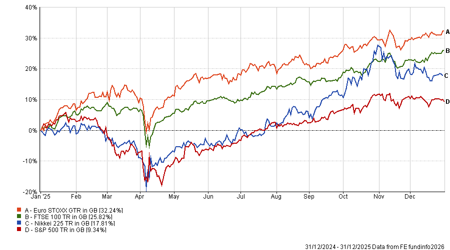 Performance of the Nikkei 225 vs FTSE 100, Euro Stoxx and S&P 500 in 2025 (in sterling terms)