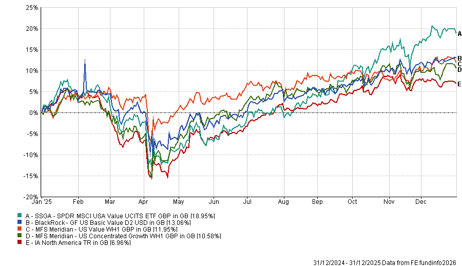 The $2bn MFS Meridian US Value fund is managed by Nevin Chitkara and Katherine Cannan and follows a traditional value approach, seeking high-quality and attractively valued large-caps offering downside protection. It made a 12% gain in 2025.