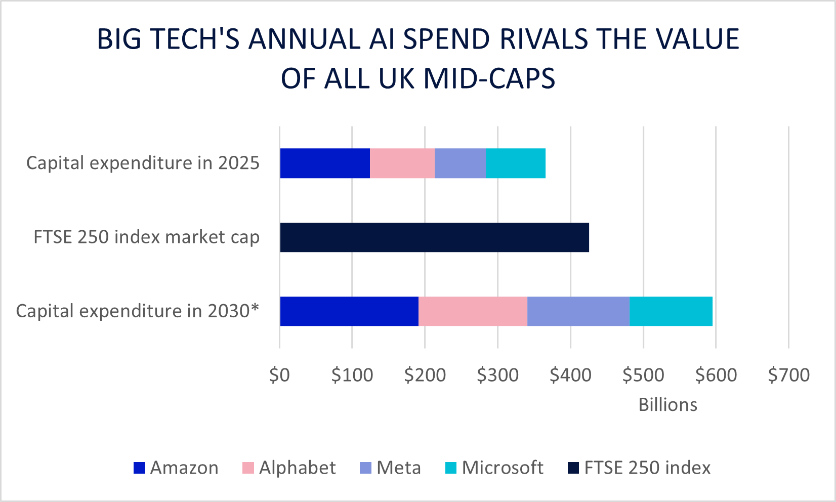 Source: FactSet; data is calendar year as of 26 Jan 2026; *2030 expected capex from company forecasts, Microsoft is assumed same capex as 2028 (its farthest-out forecast).