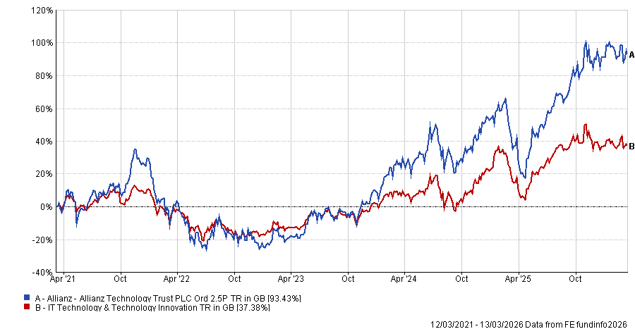 Performance of Allianz Technology Trust vs sector over 5yrs
