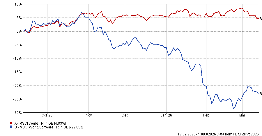 Source: FE Analytics. Total return in sterling between 13 Sep 2025 and 13 Mar 2026