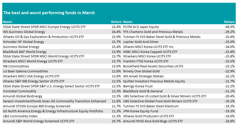 Turning to individual winners and losers, energy was the clear success story, with a barrel of Brent crude jumping to more than $100 around the middle of March and staying there for the final two weeks.