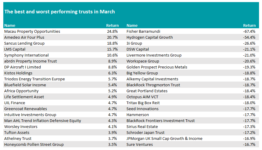 Macau Property Opportunities topped the tables with a gain of 24.8% in March, with Amedeo Air Four Plus, Sancus Lending Group, LMS Capital and Symphony International rounding out the top five. All made double-digit returns last month.