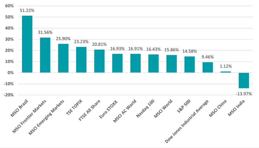 IA Latin America is close behind with a 45.5% average return, reflecting the strong performance of Peru (up 91.2%), Colombia (82.9%), Brazil (51.2%) and Mexico (49%). The countries’ stock markets are beneficiaries of a weaker dollar, rising commodity prices and market-oriented reforms.