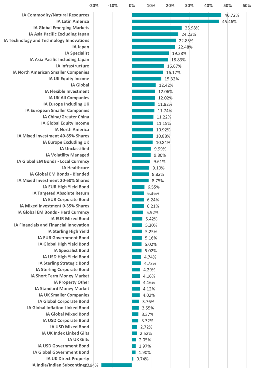 Given this backdrop, the performance of fund sectors in the Investment Association universe should not be too surprising, with IA Commodity/Natural Resources topping the leaderboard thanks to an average return of 46.5%.