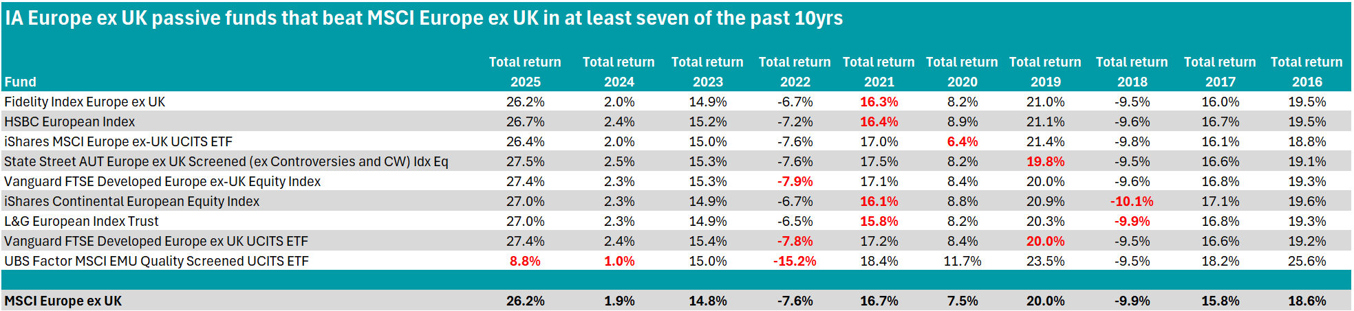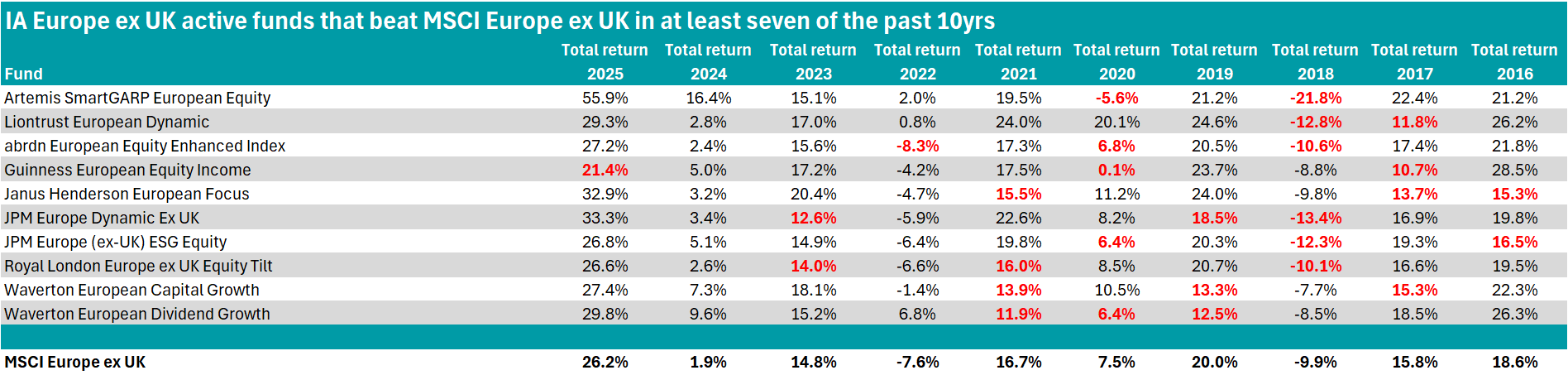 Source: FE Analytics. Figures highlighted in red represent years in which a fund underperformed the MSCI Europe ex UK.